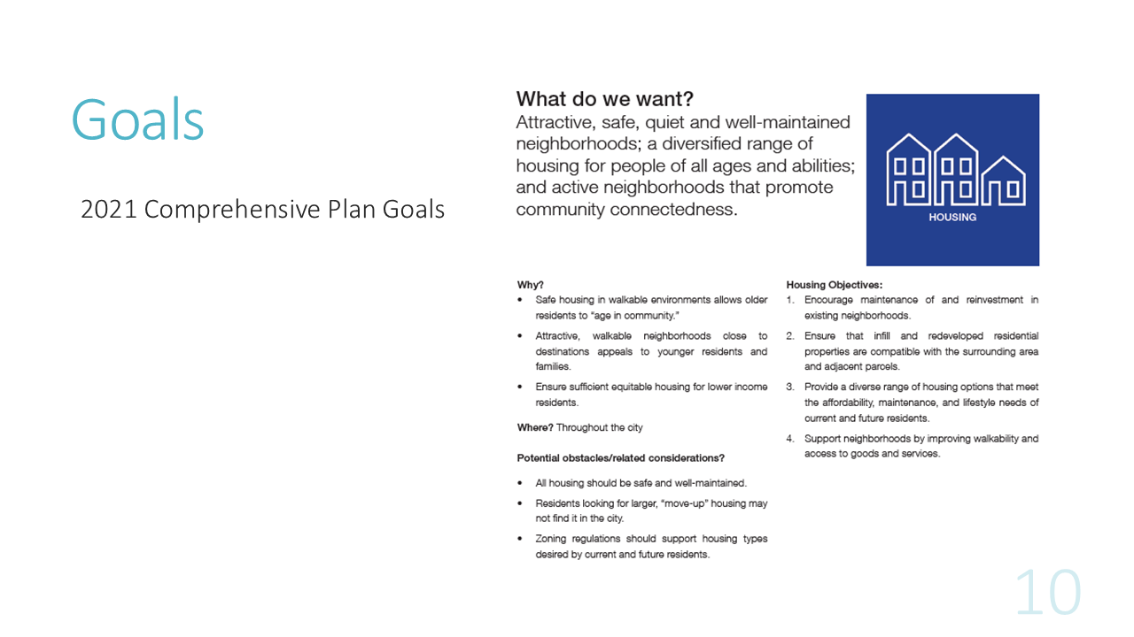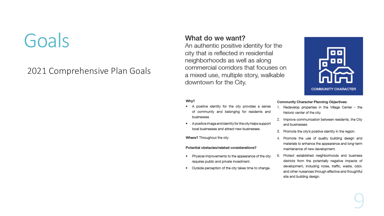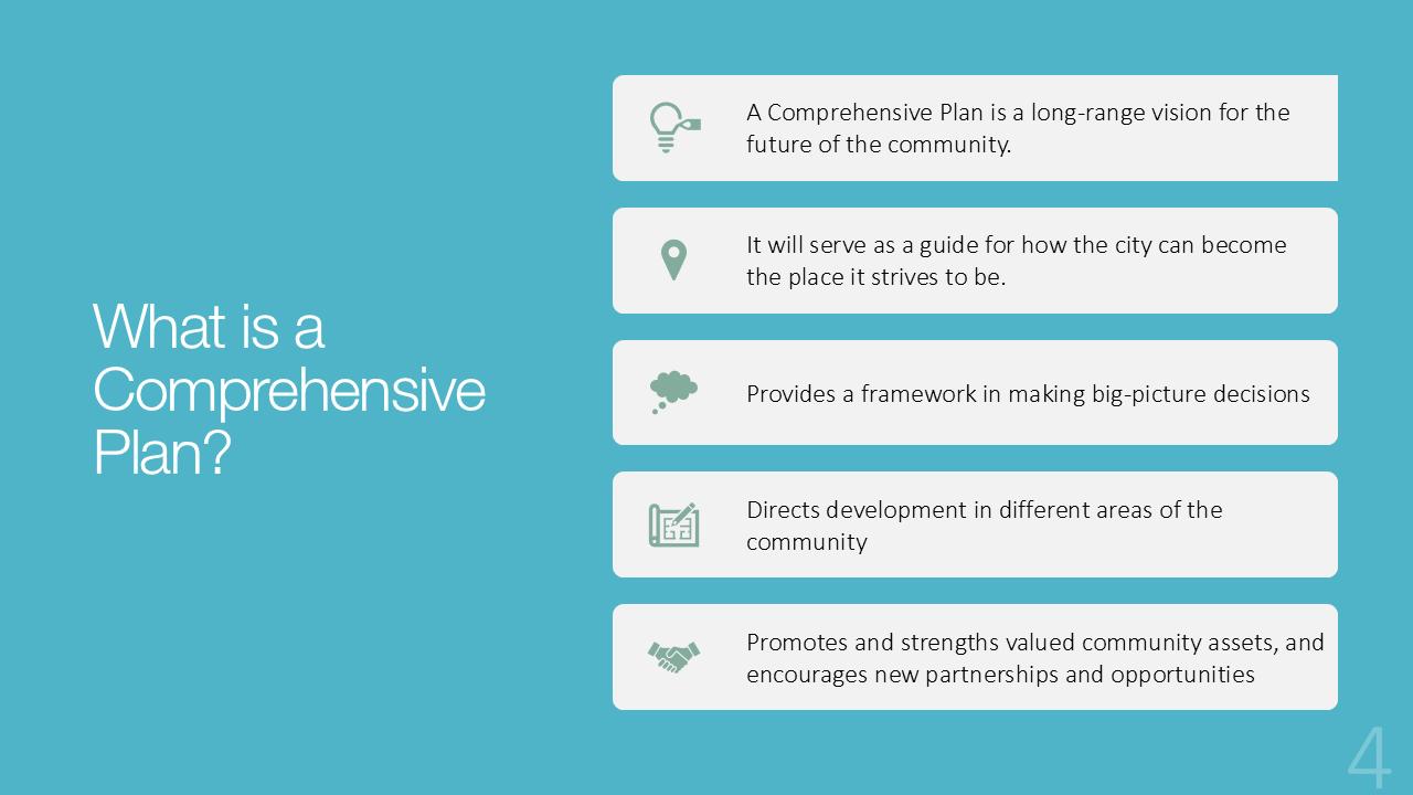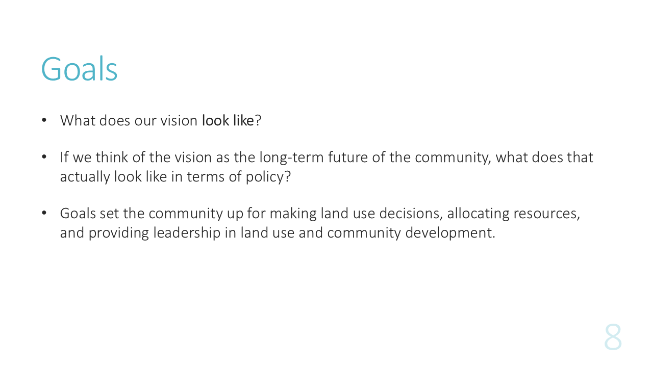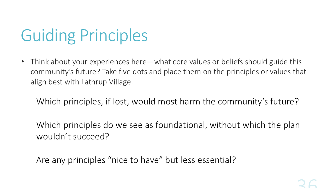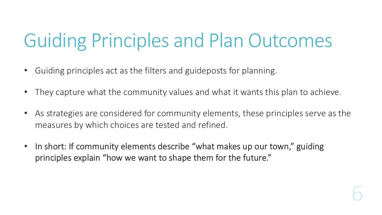 Guiding principles are statements that will be used to direct strategies in the comprehensive update to ensure they align with the community’s values. They are a very broad framework that allow for a lot of flexibility (as the update process is dynamic and ongoing) but also act as the first step toward focusing in on what the community needs from the update process.