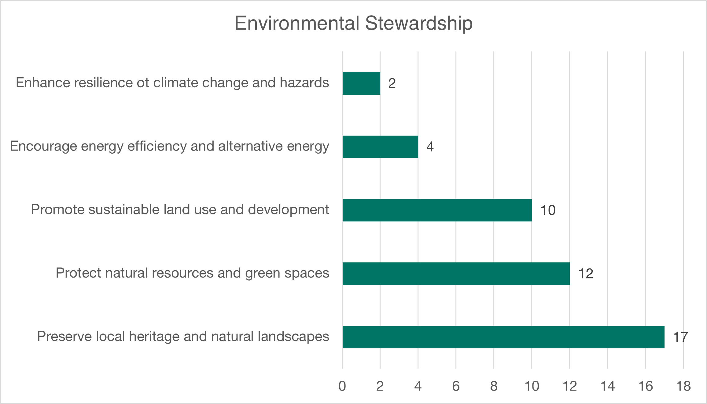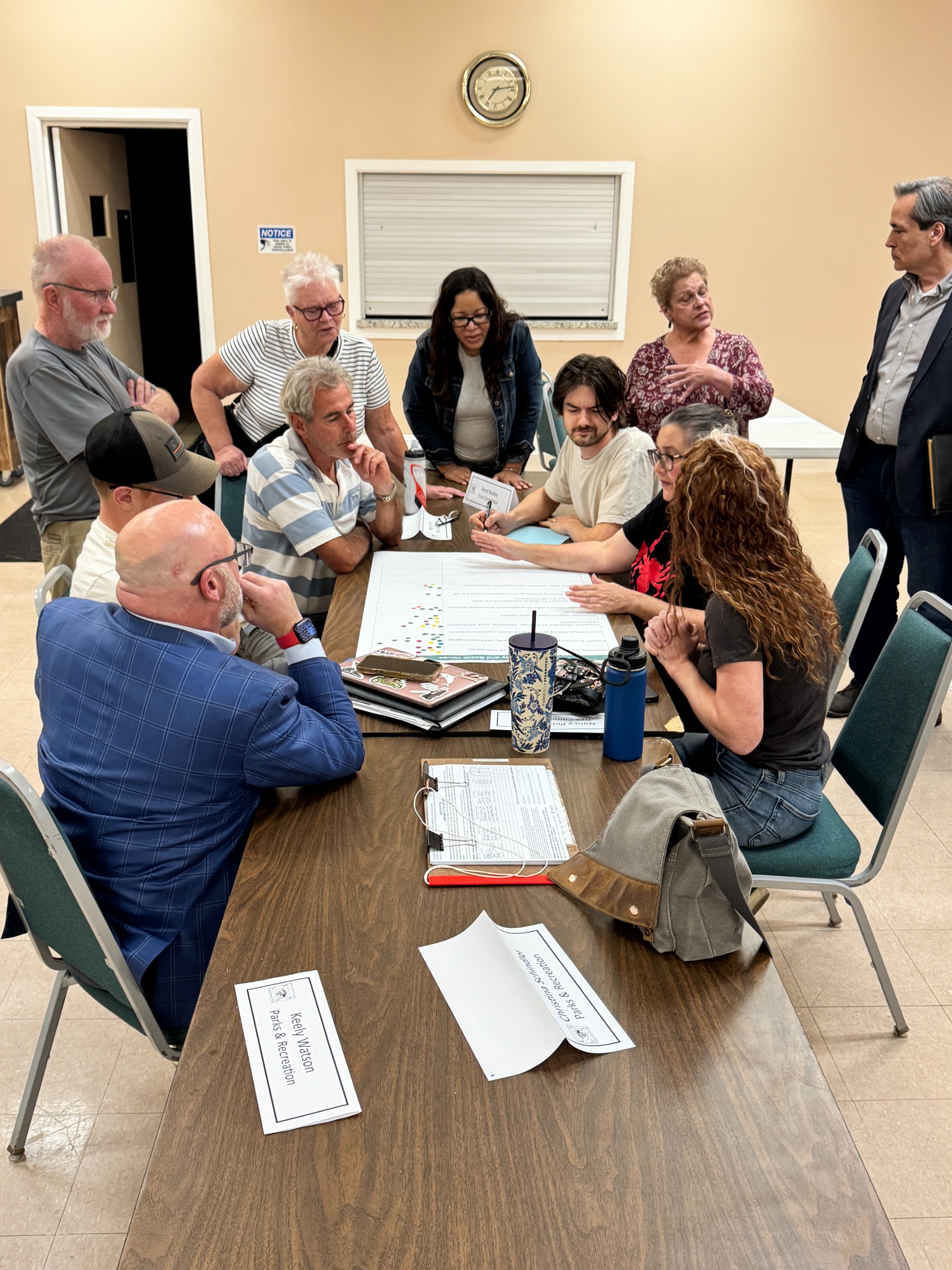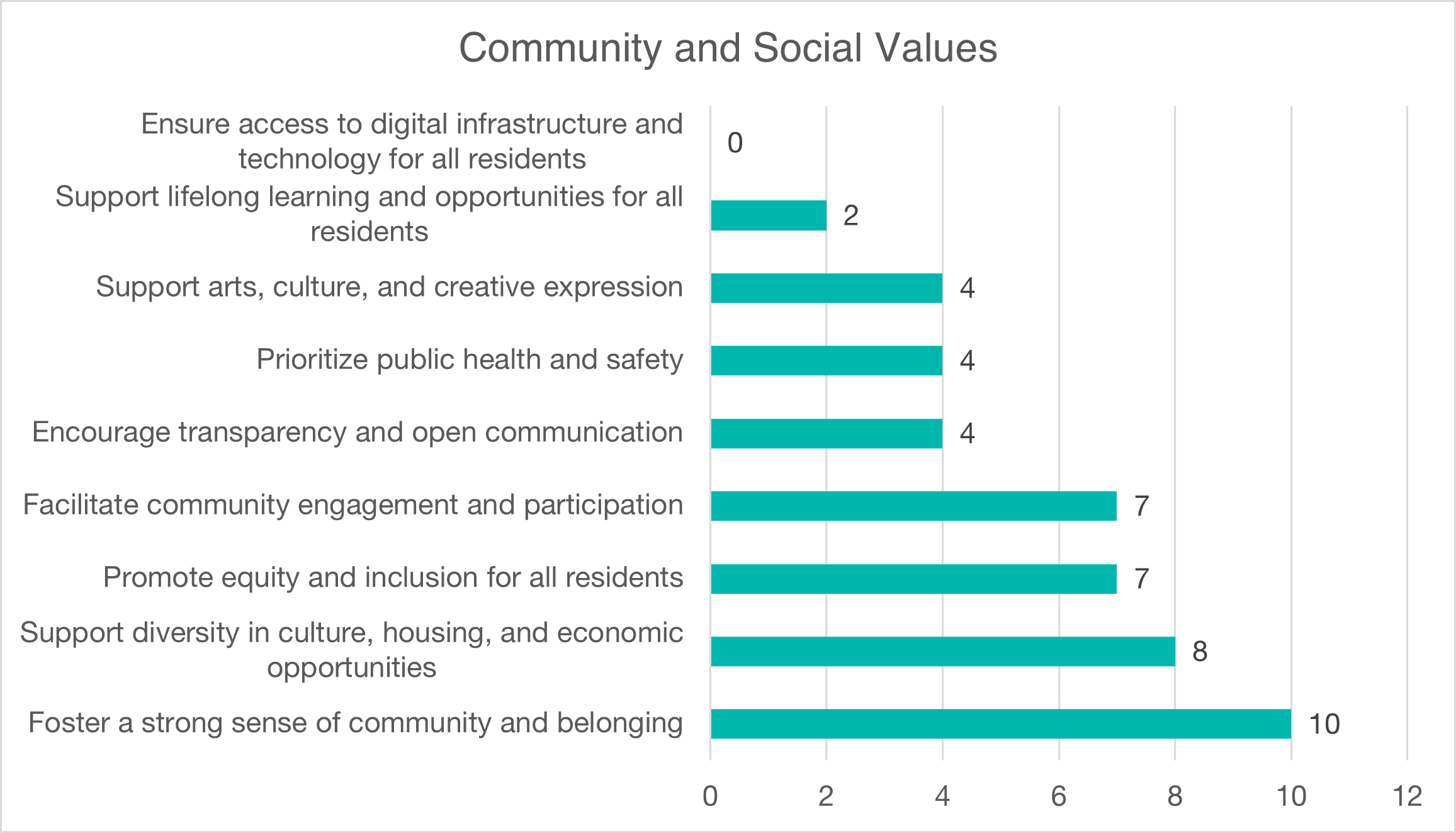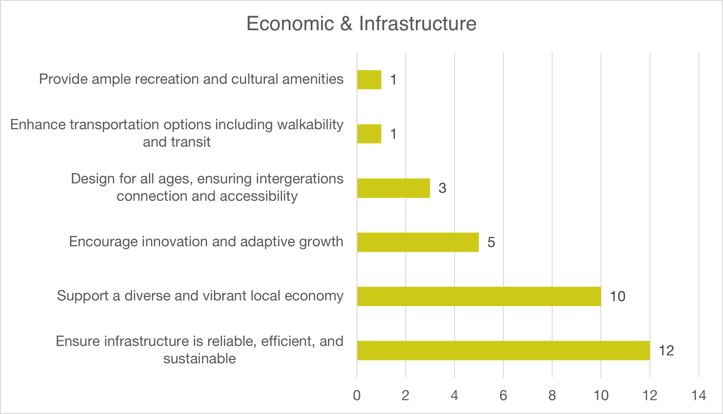 The first activity asked participants to help shape and refine the guiding principles for the 2026 Comprehensive Plan Update. Participants considered several guiding principle ideas that were categorized across four broader categories: Community and Social Values, Economy and Infrastructure, Environmental Stewardship, and Governance and Planning. Each participant had five votes and were able to disperse their votes however they wished. Following the initial voting, participants split into groups to further discuss the principles and adjust and refine them.