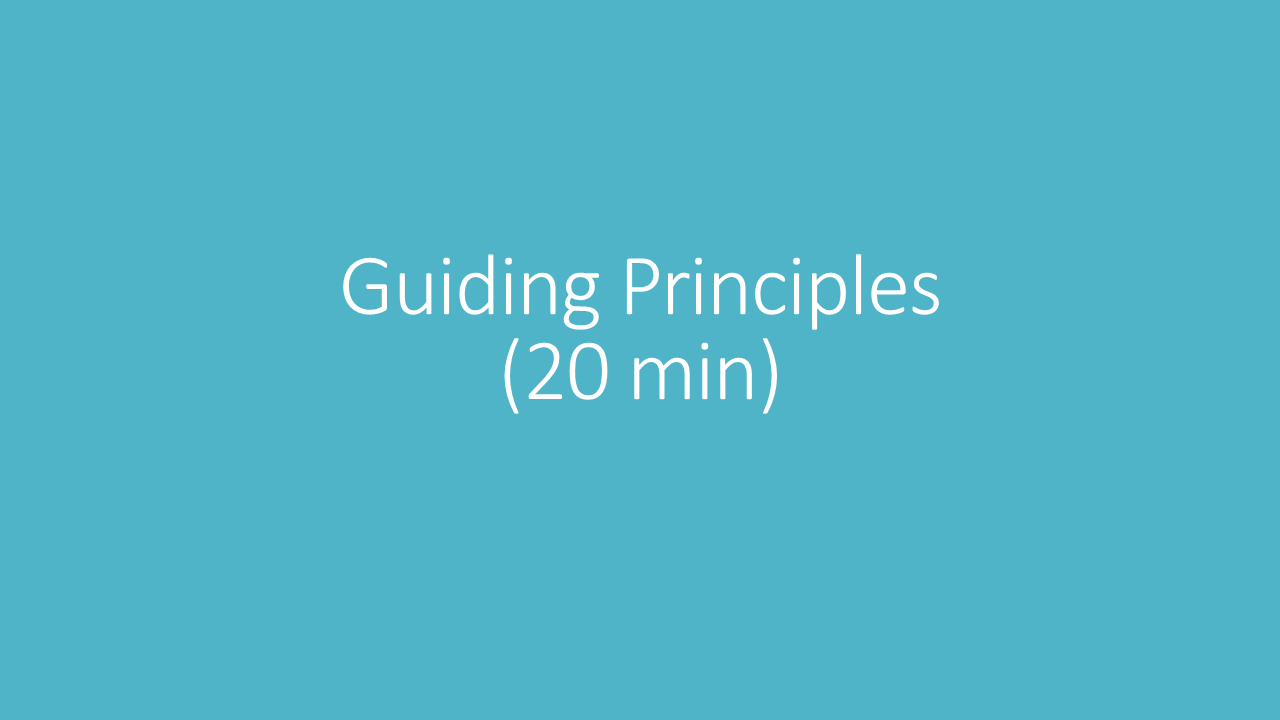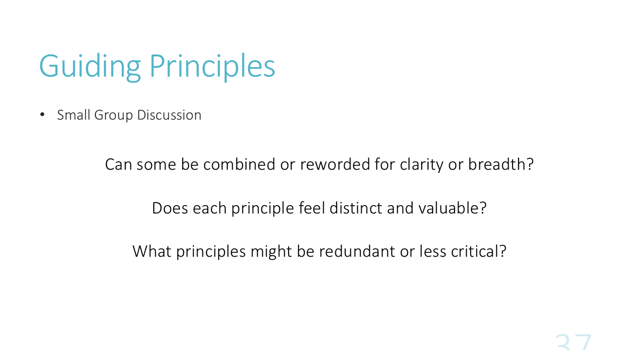 Each small group reported out their top guiding principles to the larger group and consensus was built around the following six: