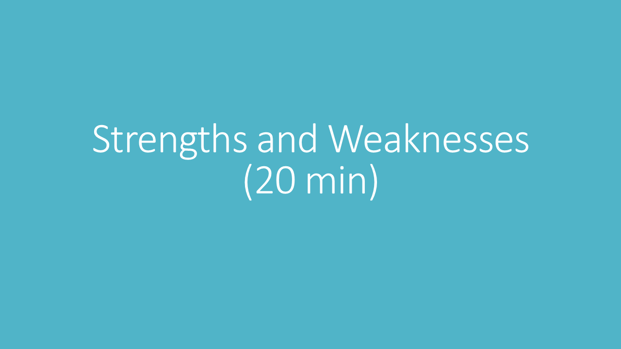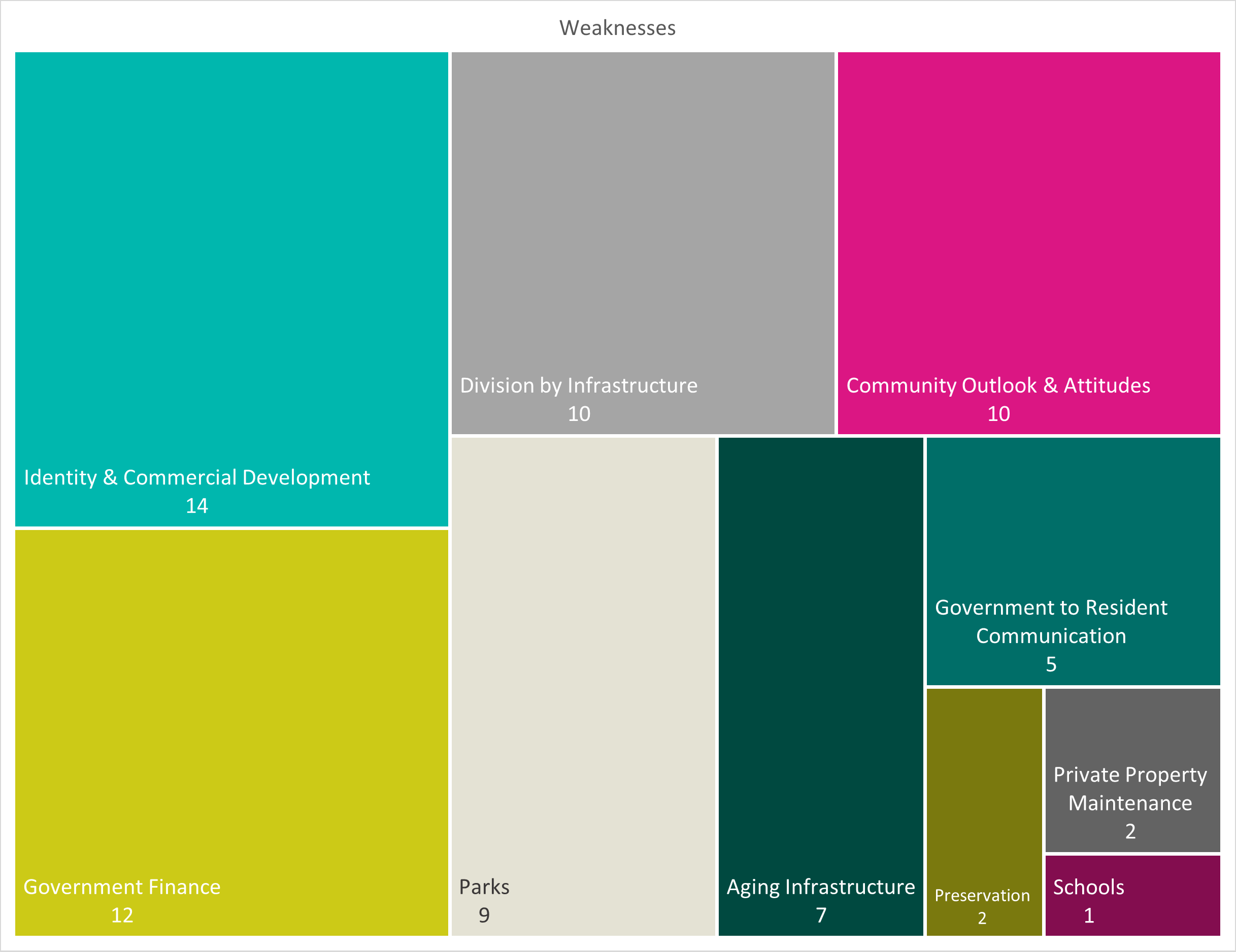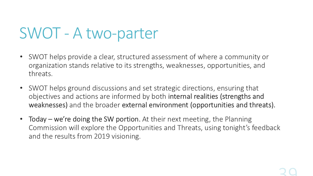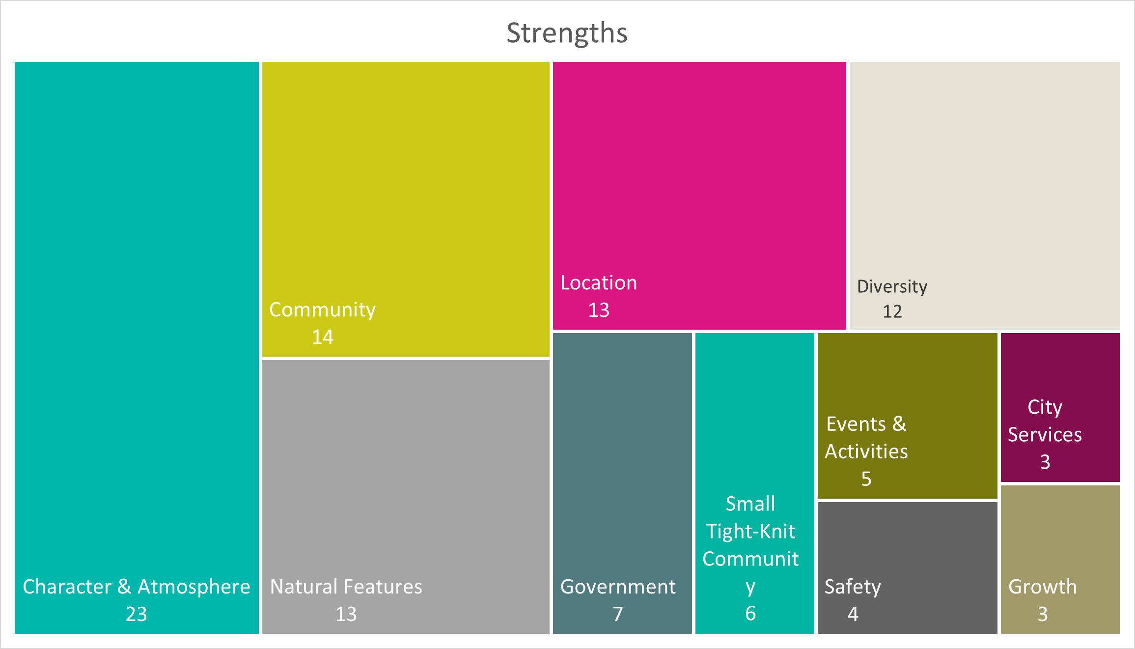 One way for a community to start thinking about and discussing future planning strategies is by brainstorming Strengths, Weaknesses, Opportunities, and Threats (SWOT). This process is a way for people to start thinking about ideas and it is often done more than once during the update process as it evolves and becomes more focused. The second activity at the kick-off meeting ended the night with a preliminary brainstorm about the strengths and weaknesses of the community. Participants were each given 10 sticky notes, five for strengths and five for weaknesses. They were asked to give their input on what they felt the community did well or what they wanted to enhance or protect (strengths) and then elements that they felt were missing or could be improved (weaknesses). Participants then placed their sticky note input on the wall and categorized them by topic. These notes were collected and compiled into their sorted topics to determine common themes amongst the comments.